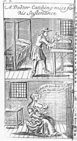 Roger de Poictiers built the Castle of Liverpool,[1] which was used as a debtors prison. This remained the case, until during the reign of George II, when the castle was pulled down. Debtors henceforth resided in the castellated mansion of the Earl of Derby[2]. Pitt describes the prisons physical dimensions in 1690 as being, “sixteen foot in length and twelve foot in breadth, in which was Two Houses of Office, it being one room, and no yard to walk in”[3]. Thomas Morgan was placed in Liverpool debtors’ prison in approximately 1690 for the sum of eleven pounds debt[4]. He was a ‘Chrurgeon’ whose practice had fallen on hard times after he had become lame. Unhappily, his wife came down with the fever and his children with the pox at about the same time as his financial decline[5]. During his year and a quarter confinement Morgan had no bedding or sustenance allowance and was forced to catch mice to stave off starvation.[6] Such privations were not restricted to Morgan, but were also extended to his wife, who upon complaining about Morgan’s confinement with felons and highwaymen was herself imprisoned under close confinement and was restricted from obtaining access to her husband. She and her three month old child also received no allowance and survived solely on the charity of her neighbours.[7] Thomas Row, the gaoler of Liverpool debtors’ prison did not remedy the alleged ill treatment that Morgan had received but instead beat him and put him in irons.[8]